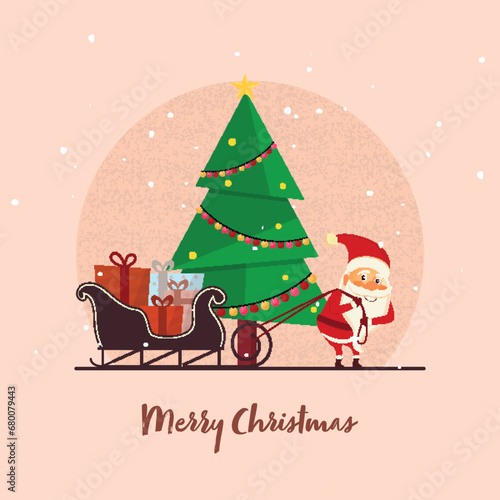 Vector illustration of Santa Claus riding sleigh. It is snowing. Winter landscape. Cartoon characters. Merry Christmas and Happy New Year design element in flat style.