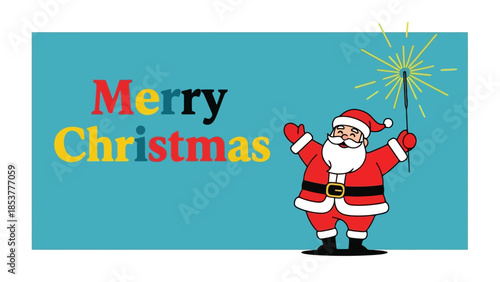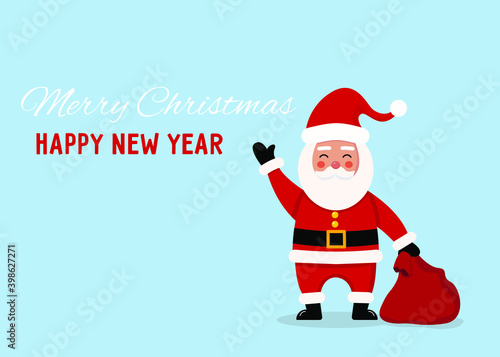 Vector illustration of Santa Claus with sack full of presents. It is snowing. Winter cityscape. Cartoon character. Merry Christmas and Happy New Year design element in flat style.