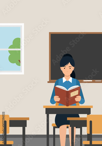 Vector illustration of schoolboy and schoolgirl sitting at the desks in classroom at the lesson. School concept design element in flat style.