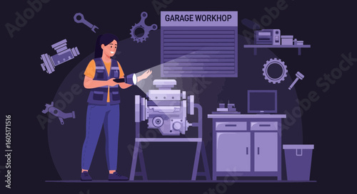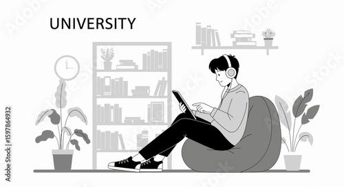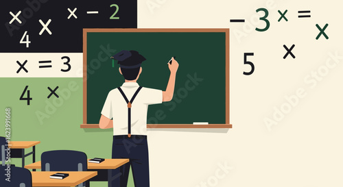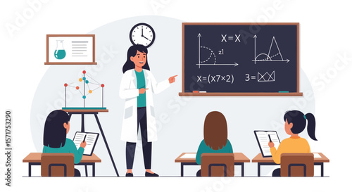 Vector illustration of scientist male looking through microscope, investigating objects. Laboratory interior and equipment design element in flat style.