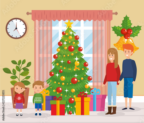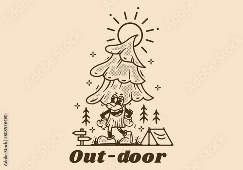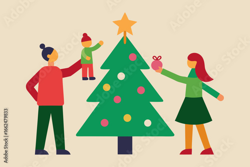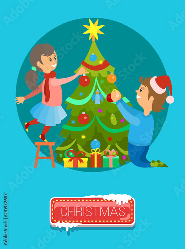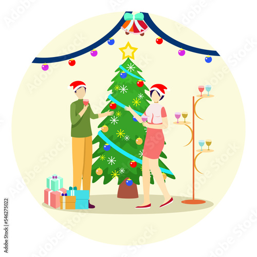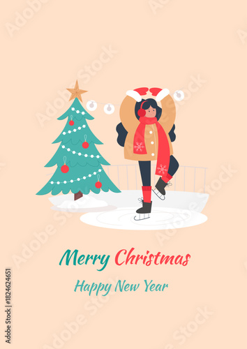 Vector illustration of Snow Maiden standing near decorated New Year tree with gifts. Cartoon character. Happy New Year design element in flat style.