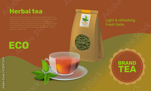 Vector illustration of modern glass teapot with freshly brewed tea, cup of hot, flavour tea and fresh, ripe lemon with slices. Popular drink for morning. Flat design
