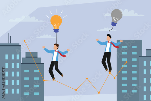 Vector illustration of businessmen with briefcases walking on tightrope like funambulist. Electric light bulbs symbol of new ideas. Business risk, success, failure concept design element in flat style