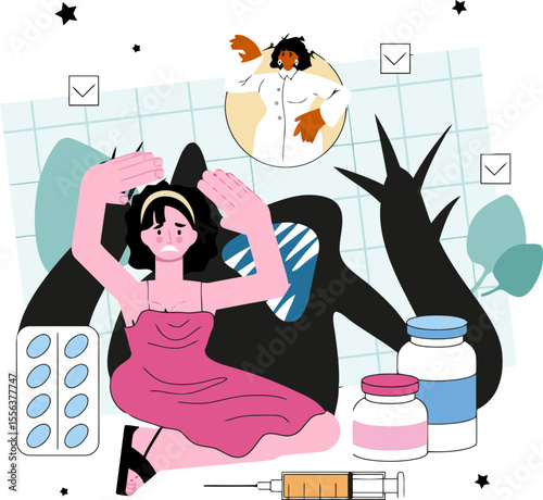 Vector illustration of beautiful woman with long wavy hair in swimsuit. Beauty and spa salon concept in retro pop art comic style.
