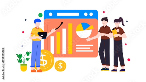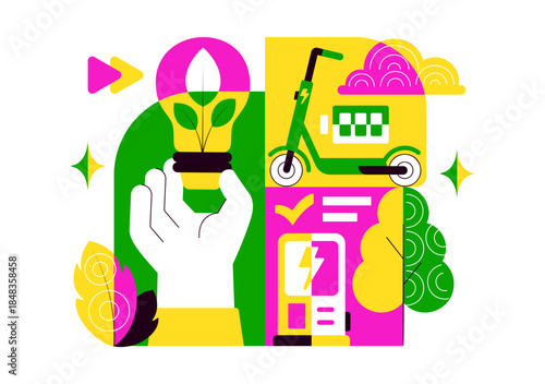 Vector illustration of young couple riding segway. Two-wheeled, self-balancing, battery-powered electric vehicle concept design element in flat style.