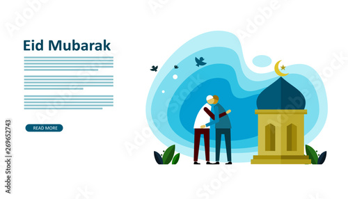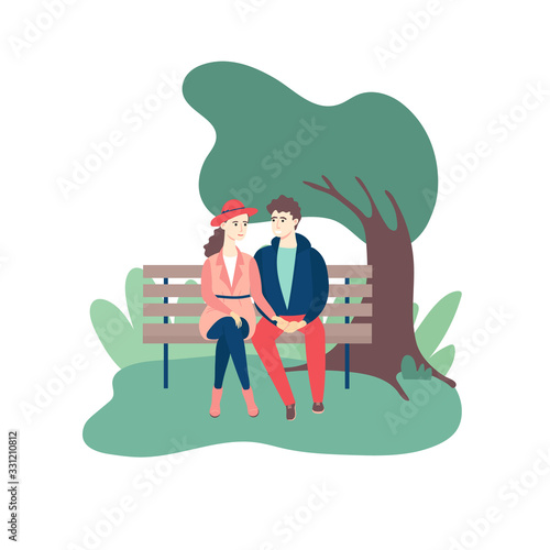 Vector illustration of young couple walking in the street. Girl and boy holding hands. Winter cityscape, snowy street, trees. Winter people activities concept design elements in flat style.