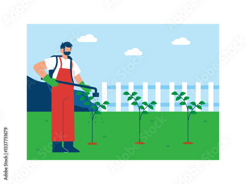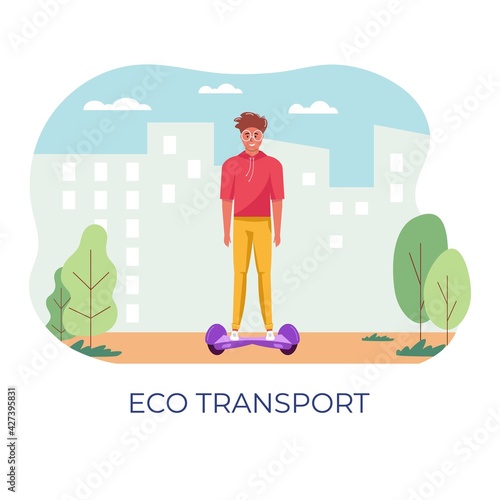 Vector illustration of young man riding gyroscooter. Self-balancing two-wheeled board, battery-operated scooter concept design element in flat style.