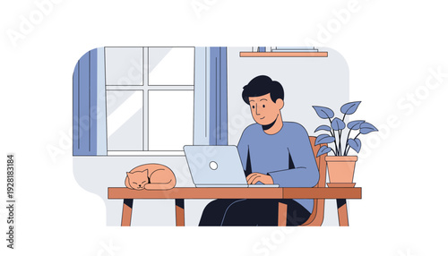 Vector illustration of young man sitting in bean bag chair and making use of tablet. Workplace interior, cartoon character, flat style design.