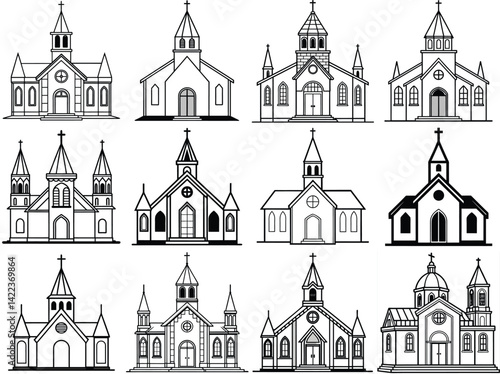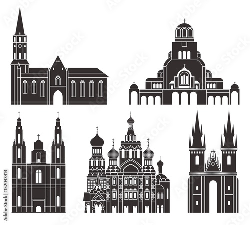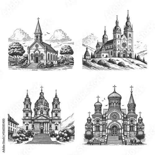 Churches set. Vector ink hand drawn illustration isolated on white background.