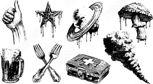 Vector ink hand drawn honey set. Honeycombs with honey, hive, bee, wooden stick, flower, honey jar. Sweet natural organic honey vintage sketch illustration.