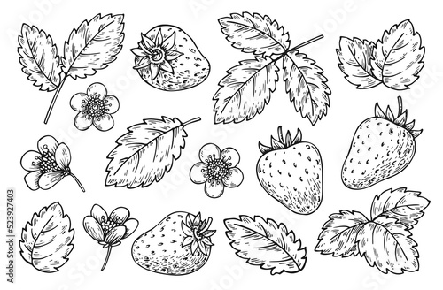 Vector ink hand drawn style berry set. Strawberry, cherry, blueberry, sea buckthorn, raspberry vintage sketch illustration for recipe, menu, print.
