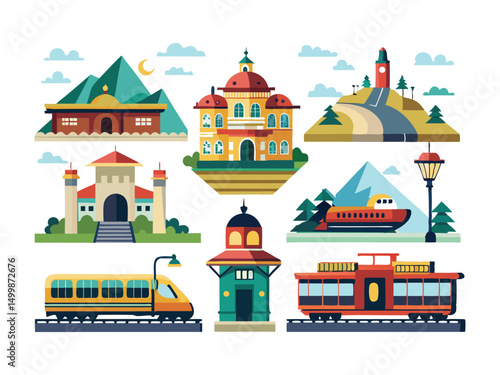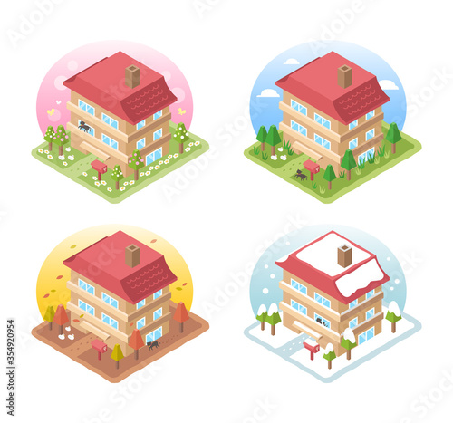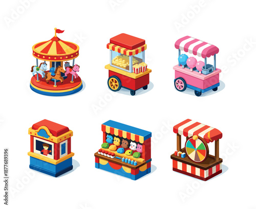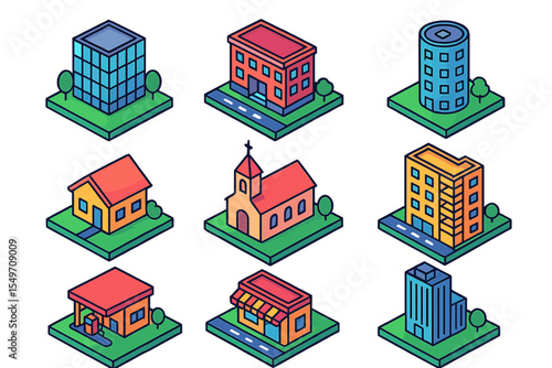 City shop building icon set. Vector isometric illustration of different shops isolated on white background. Pet music book flower and hardware store buildings exterior view.