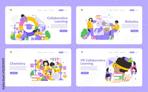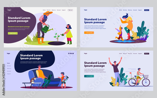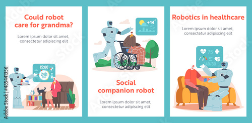 Vector isometric horizontal banner set with medical, household, hotel and restaurant service robots helping or serving people and copy space.
