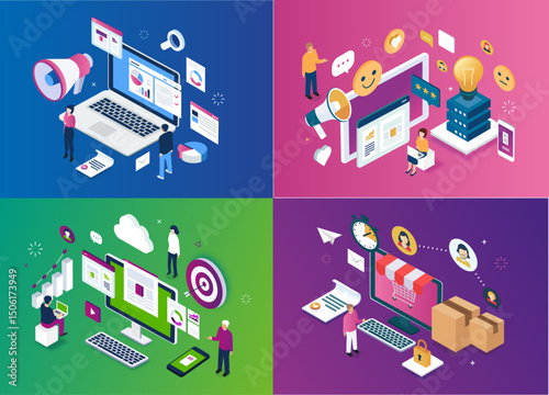 Home and service robots vector isometric poster, banner template set. Medical, household, security, hotel and restaurant service robots design elements.