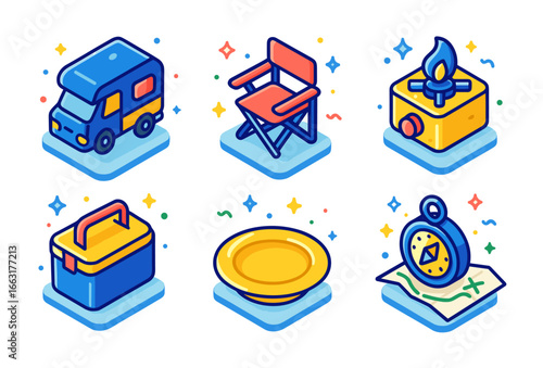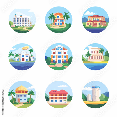 Public catering building icon set. Vector isometric illustration of different food establishments cafe, shop, restaurant buildings exterior view. Bakery burgers pizza coffee hotdogs and asian food.