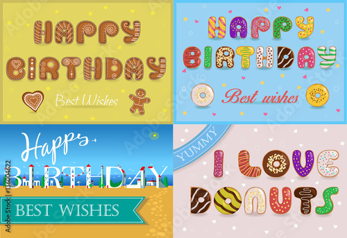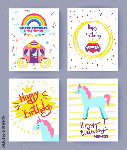 Kids birthday party invitation card vector template with hand drawn funny and cute characters, sweets, cake, gift boxes, party decorations and hand lettering.