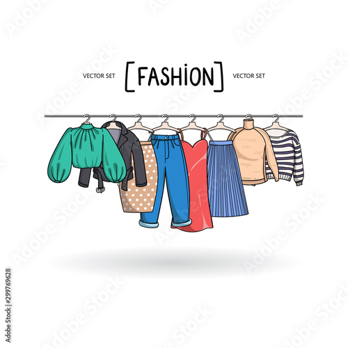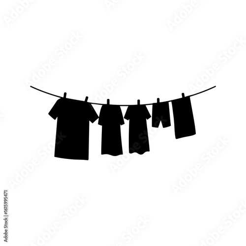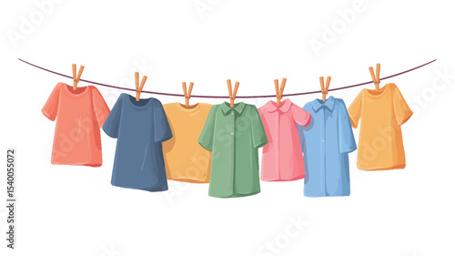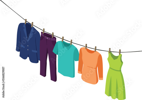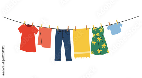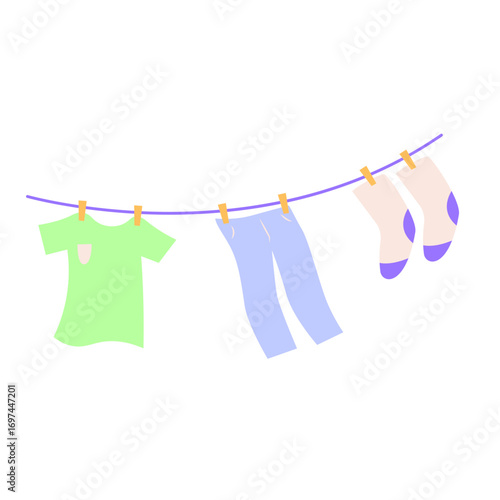 Vector laundry clean dry clothes hanging on rope clothesline. Washed shirt and t-shirt on hangers for clothes, socks and pants hang on clothespin isolated on white background