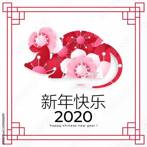 Vector layered paper cut style Happy Chinese New Year creative composition with rat silhouette on china city skyline background with temple, cherry blossom, lanterns. Greeting card template.