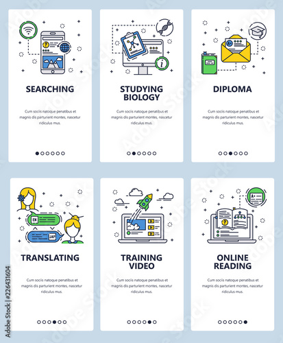 Vector set of mobile app onboarding screens. Work balance, Focusing on solution, Daily tasks, Productivity improvement, Range of options, Multitasking problems web templates. Thin line art flat icons.