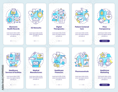 Vector set of mobile app onboarding screens. Soft drink, Palm island, Outdoor, Mountains, Sign, Camera web templates and banners. Thin line art flat icons for website menu.