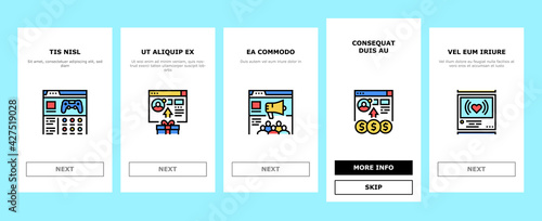 Vector set of mobile app onboarding screens. Server, Computer, Website uptime, Program code, System update, Data structure web templates and banners. Thin line art style design icons for website menu.