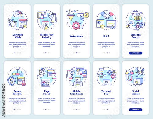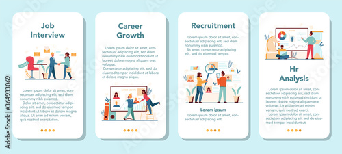 Vector set of mobile app onboarding screens. Coffee Break, Remote Control, HR Management, Transfer, Social, Data web templates and banners. Thin line art style design icons for website menu.