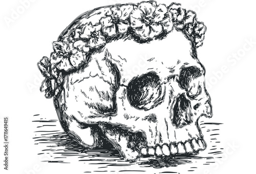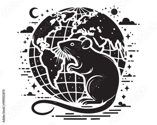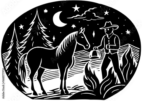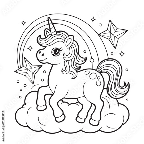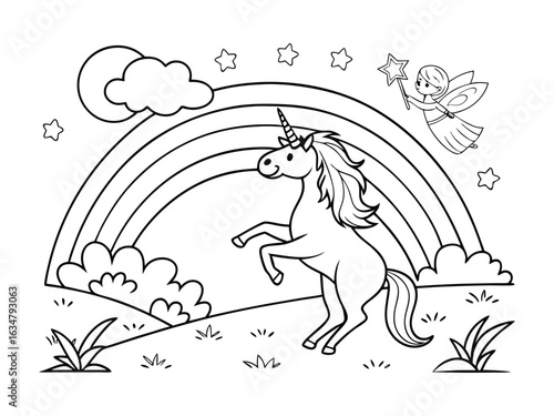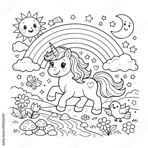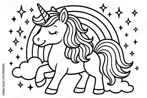 Magical unicorn tattoo or t-shirt print design. Vector sketch unicorn head combined with night sky, rainbow, clouds, planets.