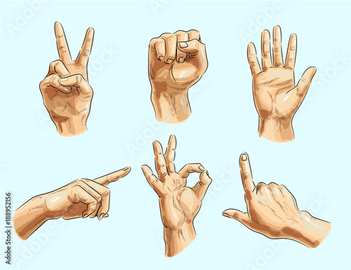 Vector male hand gesture icon set. Victory or peace sign, clenched fist, pointing finger, okay and other hand signs.