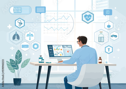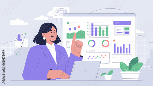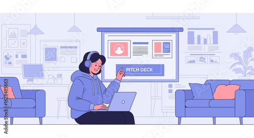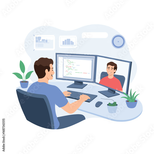Vector man vip passenger of business class inside airplane illustration. Businessman freelancer working on laptop online drinking wine eating pineapple. Comfort aircraft travel concept