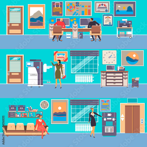 Vector set of modern workspace interiors with office furniture and equipment. Office workers in various situations, flat style illustration.