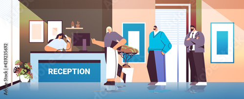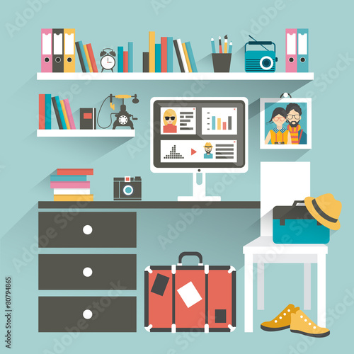 Vector set of modern workspace interiors with office furniture and office equipment. Business people in office, in meeting room and in boardroom, flat style illustration.