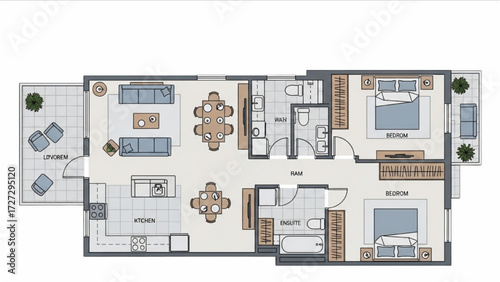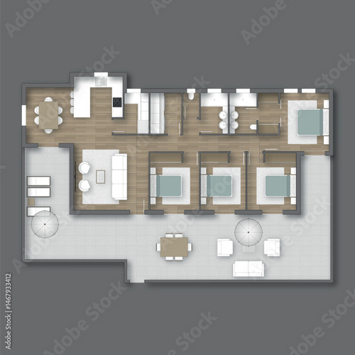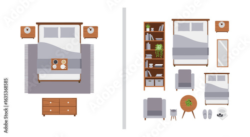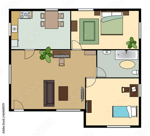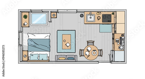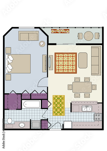 Vector top view color architectural floor plan of one bedroom apartment. Modern dining room, bedroom and bathroom interior with furniture.