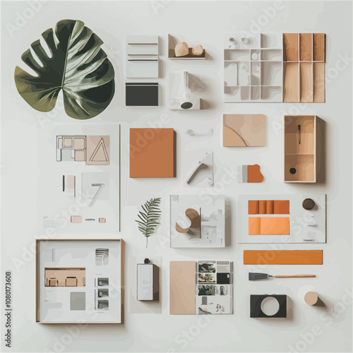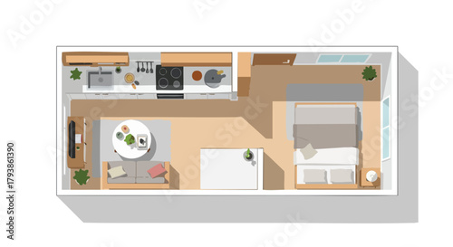 Vector top view color architectural floor plan of modern studio apartment which combines living room, bedroom and kitchenette with furniture.