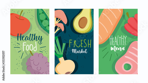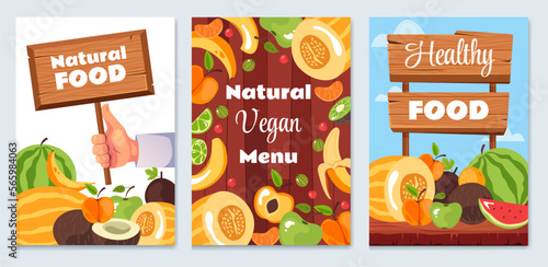 Vector set of fruit banners with paper cut ripe fresh red apple, yellow pear, apricot and plum summer fruits.