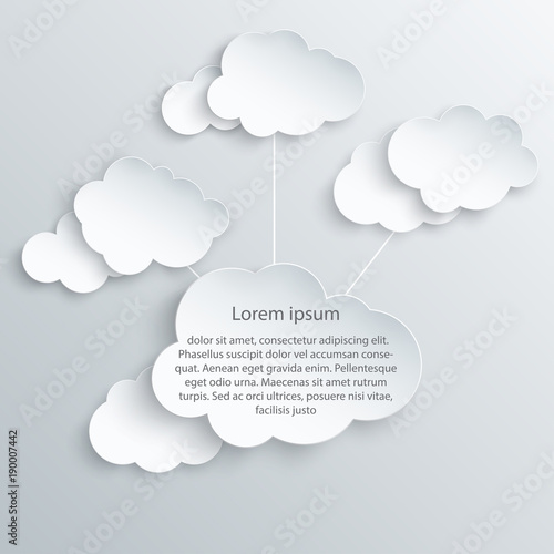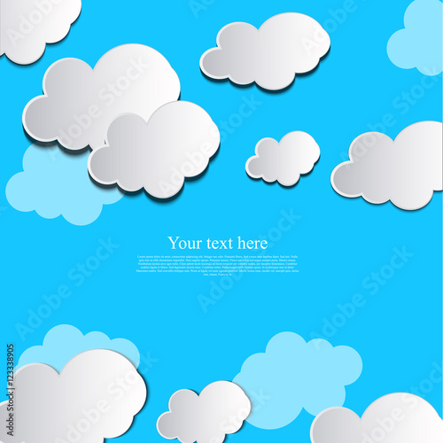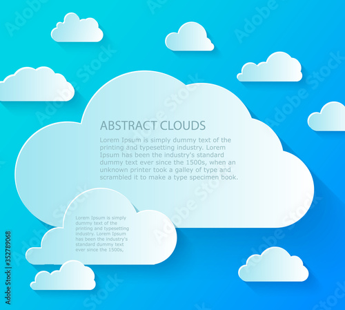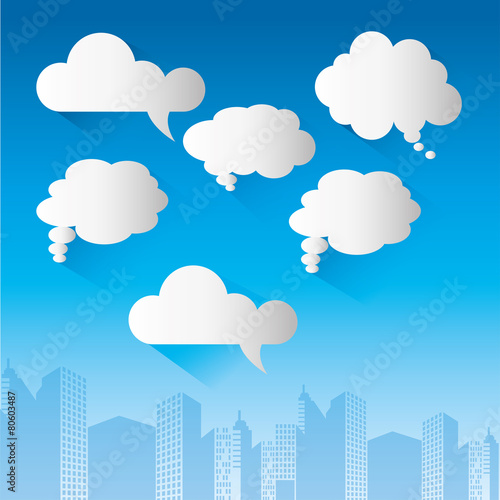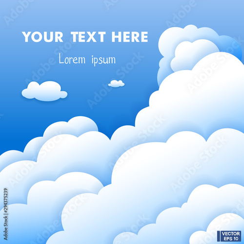 Daylight sky with sun, white clouds, flying hot air balloons, cityscape and copy space. Vector illustration in paper art style. Cityscape background, poster, flyer, banner template.