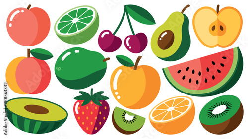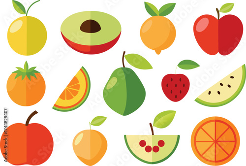 Vector paper cut craft style fresh summer fruits and berries. Sweet watermelon slice, apple, plum, pear, cherry, kiwi, orange, lime, pomegranate, strawberries and tropical fruits. Healthy diet food.
