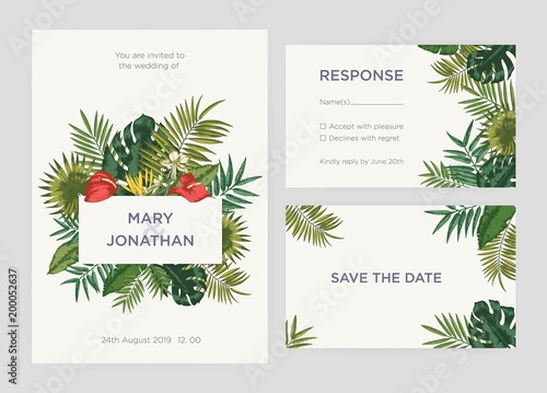 Exotic travel landing page website template. Vector paper cut tropical dream round frame with tropical flowers, palm leaves and pink flamingo.