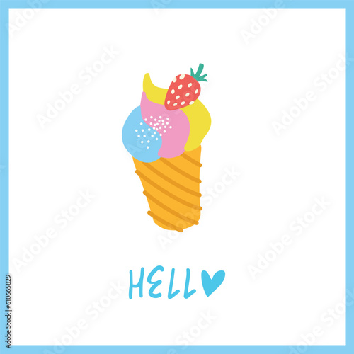 Fruit ice cream poster banner design template. Vector paper cut ice cream cone with fruit juice splashes and fresh starwberry, cherry, sliced kiwi, lime, mango, orange.