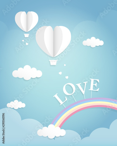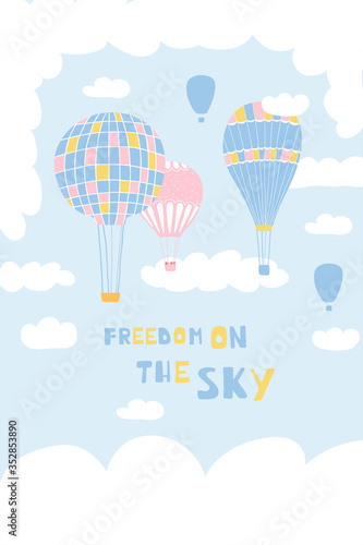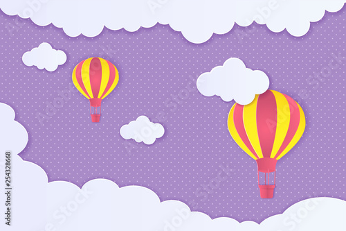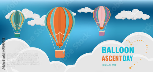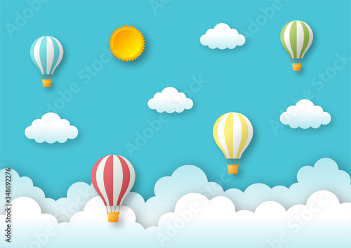 Daylight sky with sun, white clouds, flying hot air balloons, snowy mountain peaks and copy space. Vector illustration in paper art style. Mountain background, poster, flyer, banner template.