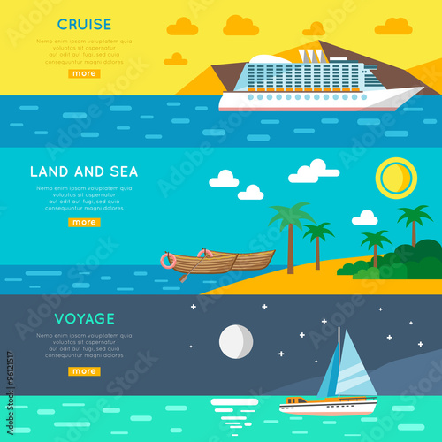 Sea cruise landing page website template. Vector paper cut cruise liner floating on ocean waves, dolphins, seagulls, islands, tourist resorts. Sea voyage concept.