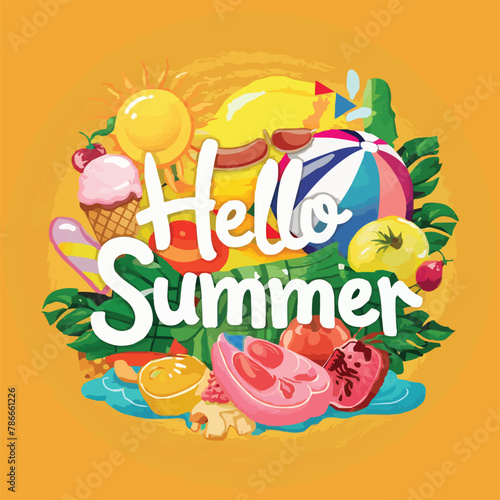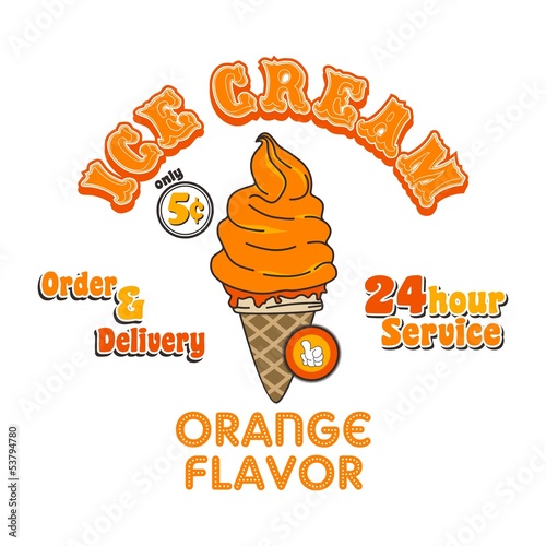 Tropical fruit ice cream poster design template. Vector paper cut ice cream cone with fruit juice splashes and fresh sliced kiwi, lime, mango, orange.