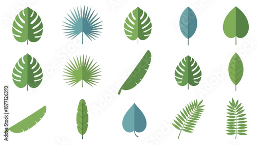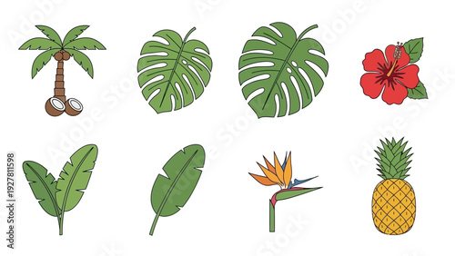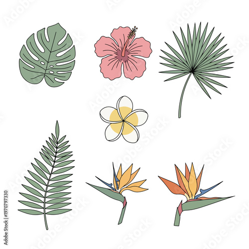 Tropical plant set. Vector paper cut monstera, bamboo, cocos palm leaves, hibiscus hawaiian aloha, frangipani flowers etc. Modern craft style design elements for party invitation greeting card poster.