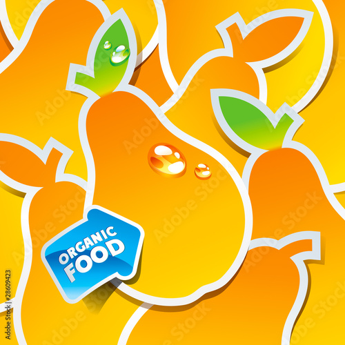 Ripe fresh yellow pear fruit background, frame. Vector paper art illustration. Packaging label design template.
