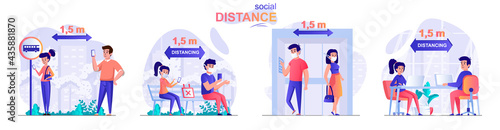 Vector people looking at posters with cancelled events. Cancellation of social mass or political gatherings, sale discount and different shows due to pandemic or war causes