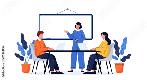 Vector people of different age walking on city street illustration. Man and woman, teenager student and children over cityscape background. Busy citizens in megalopolis