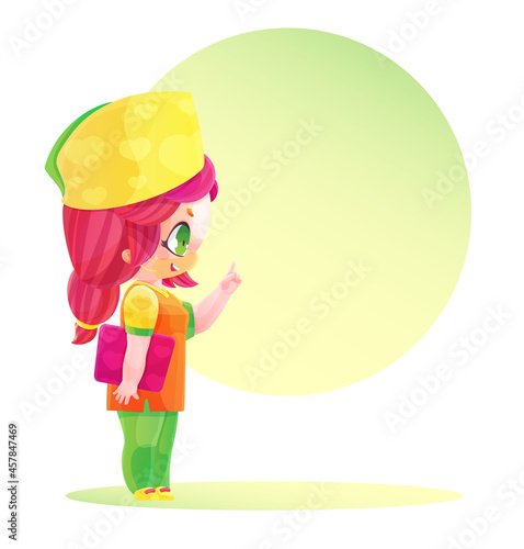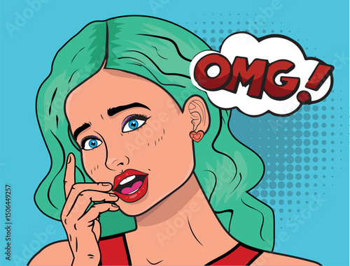 Vector illustration of april fools day woman in jester hat. Beautiful woman clown in retro pop art comic style.