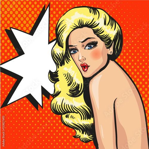 Vector illustration of beautiful blond woman with Pooof speech bubble. Sexy pin-up girl in retro pop art comic style.