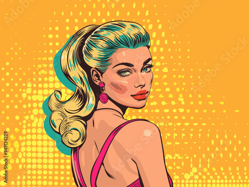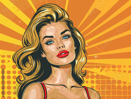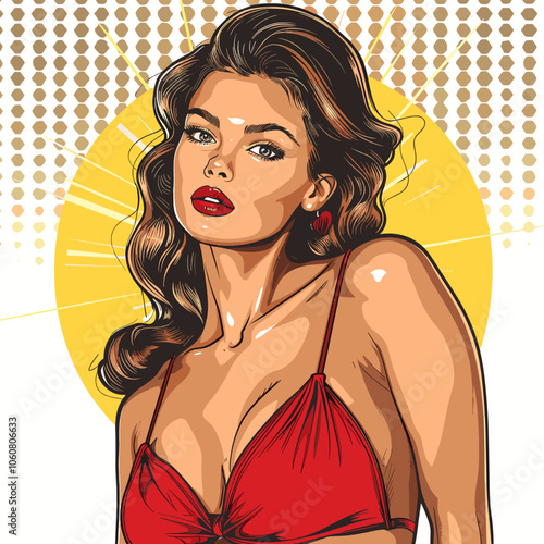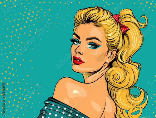 Vector pop art beautiful woman side view portrait. Redheaded sexy pin-up girl with eyes closed in comic book style.