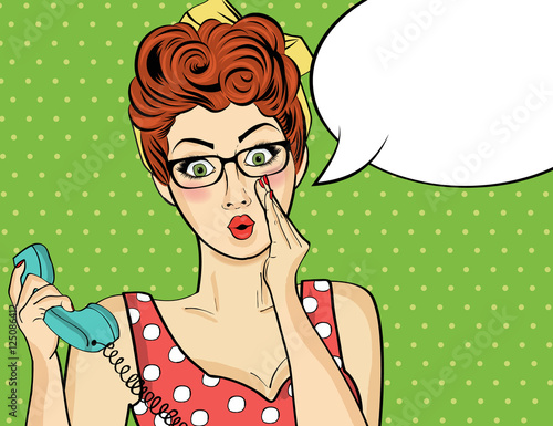 Vector illustration of beautiful sexy brunette woman. Pretty pin-up girl with green eyes in pop art retro comic style.
