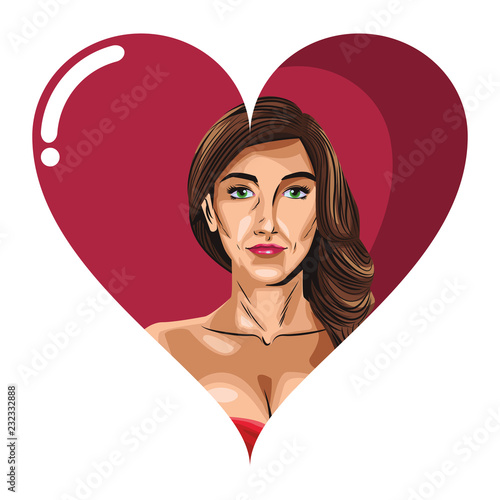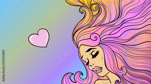 Vector illustration of sexy pin up girl with long waving pink hair. Beautiful glamour woman portrait in retro pop art comic style.